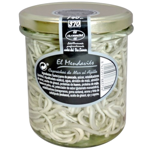 surimi, agua, almidón de maíz, almidón de arroz, aceite de girasol, proteínas de huevo , proteína de soja, huevo en polvo, sal, cayena, ajo...
